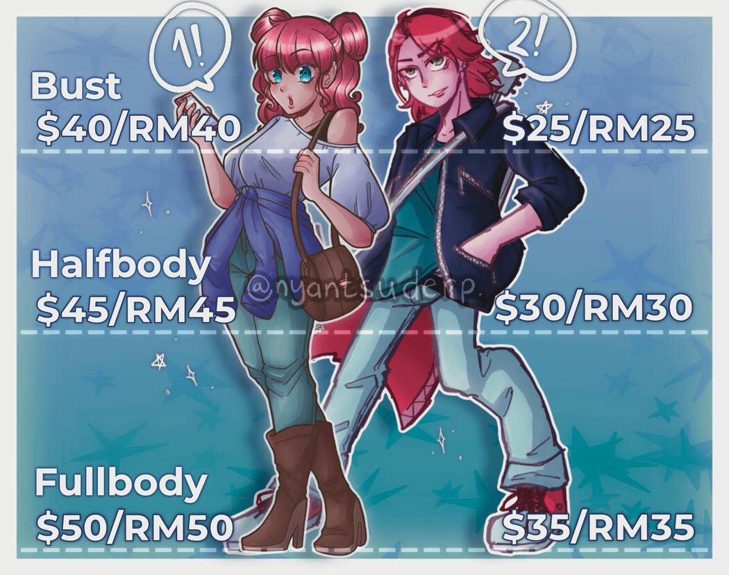 Halfbody/Thigh-up | $30//RM30 | $45//RM45 |
